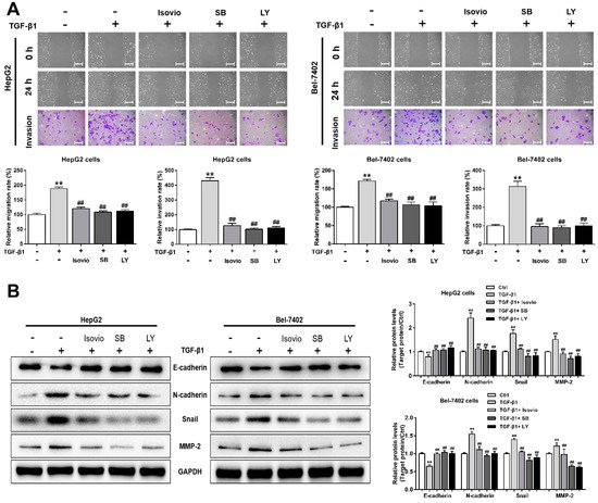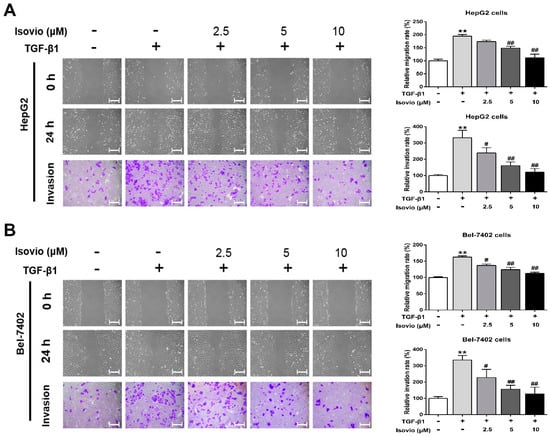 Effects of isoviolanthin on TGF-β1-induced migration and invasion of HCC cells. (A) HepG2 and (B) Bel-7402 cells were pretreated with 10 ng/mL TGF-β1 for 48 h, and then treated with isoviolanthin (2.5 µM, 5 µM, and 10 µM) for the last 24 h. The migration and invasion of HepG2 and Bel-7402 cells were measured by wound healing and transwell assays. Scale bars: 100 µm. Representative images and bar graphs (mean ± SD) are shown, n = 3. The magnification is ×100. ** p < 0.01 versus the control group; # p < 0.05, ## p < 0.01 versus the TGF-β1 group.