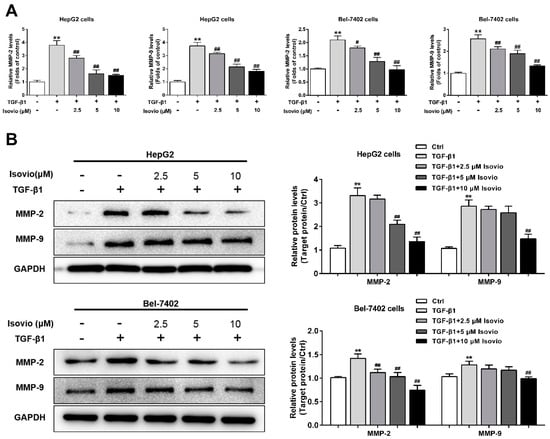 Since MMP-2 and -9 exert a critical role in the invasion and migration of HCC cells, the secretion of MMP-2 and -9 in the HCC cell supernatant was analyzed by ELISA. MMP-2 and -9 secretion were remarkably increased by TGF-β1, which could be dose-dependently alleviated by isoviolanthin (Figure 4A). Furthermore, Western blotting was used to detect the protein levels of MMP-2 and -9 in HCC cells. We found that isoviolanthin (2.5 µM, 5 µM, and 10 µM) significantly inhibited the upregulation of MMP-2 and -9 induced by TGF-β1 in a dose-dependent manner (Figure 4B). These results indicated that downregulation of MMP-2 and -9 might be involved in the anti-EMT activity of isoviolanthin.