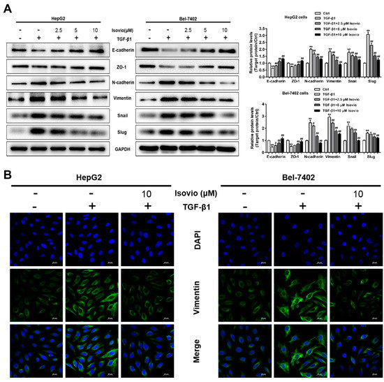 To ascertain whether isoviolanthin plays a critical role in TGF-β1-induced EMT in HCC cells, Western blot was used to analyze EMT-associated biomarkers in HCC cells. The TGF-β1-induced expression of N-cadherin, vimentin, Snail, and Slug was significantly inhibited by isoviolanthin (2.5 µM, 5 µM, and 10 µM), whereas the expression of E-cadherin and ZO-1, which was inhibited by TGF-β1, was obviously increased in a dose-dependent manner (Figure 5A). In addition, we detected the expression of the mesenchymal marker vimentin of HCC cells by immunofluorescence staining, which revealed that TGF-β1 obviously elevated the vimentin expression in HepG2 and Bel-7402 cells. Compared with the TGF-β1-treated HCC cells, 10 µM isoviolanthin significantly decreased vimentin expression (Figure 5B). These results confirmed that isoviolanthin could effectively reverse the TGF-β1-induced changes in the expression of EMT biomarkers in HCC cells.