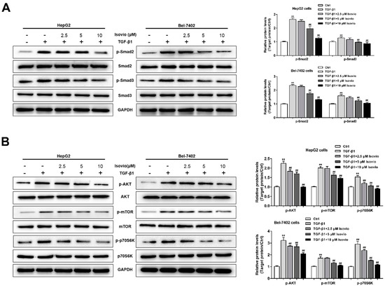HepG2 and Bel-7402 cells (2.5 × 105 cells/well) were pretreated with 10 ng/mL TGF-β1 for 48 h in 100 mm tissue culture dishes, followed by treatment with isoviolanthin (2.5 µM, 5 µM, and 10 µM), LY294002 (20 µM, MedChem Express, NJ, USA), or SB431542 (20 µM, MedChem Express) for the last 24 h. Total protein was isolated with radioimmunoprecipitation assay buffer (RIPA buffer) mixed 1% PMSF (Phenylmethanesulfony fluoride) as we described previously [45], and 30 micrograms of protein was separated by 8–12% SDS-PAGE and transferred to PVDF membranes (Millipore, Bedford, MA, USA). Membranes were blocked with 5% nonfat dry milk in tris-buffered saline (TBS)-T (0.1% Tween-20) for 2 h at room temperature and then incubated overnight at 4 °C with primary antibodies against E-cadherin, glyceraldehyde 3-phosphate dehydrogenase (GAPDH), ZO-1, N-cadherin, vimentin, Snail, Slug, mTOR, p-mTOR, P70S6K, and p-P70S6K (1:1000, Cell Signaling Technologies, Beverly, MA, USA); and Smad2, p-Smad2, MMP-2, MMP-9, Smad3, Akt, p-Akt, and p-Smad3 (1:1000, ABclonal, Wuhan, China). Blots were incubated for 2 h at room temperature with the corresponding secondary horseradish peroxidase (HRP)-conjugated goat anti-rabbit or anti-mouse IgG antibodies (1: 3000, ABclonal), and the band densities were visualized with enhanced chemiluminescence HRP substrate (Millipore, Bedford, MA, USA) and a Tanon detection system (Shanghai, China).