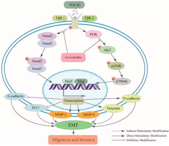 TGF-β1 is a potent inducer of EMT that can abrogate cell–cell adhesion and promote mesenchymal phenotypes and migratory and invasive capabilities of HCC cells [38,39]. Thus, we explored the effect of isoviolanthin on the migration and invasion of TGF-β1-treated HCC cells, and wound healing and transwell analyses showed that isoviolanthin obviously suppressed the TGF-β1-induced migration and invasion of HCC cells in a dose-dependent manner. In addition, ELISA and Western blot analysis indicated that upregulation of MMP-2 and -9 induced by TGF-β1 was attenuated by isoviolanthin in a dose-dependent manner. Subsequently, we investigated the molecular mechanisms of the antimetastasis effects of isoviolanthin related to TGF-β1-induced EMT in HCC cells. It is well documented that the PI3K/Akt/mTOR and TGF-β/Smad signaling pathways are becoming increasingly difficult to ignore in investigations of EMT-related mechanisms in cancer cells [40,41,42,43]. TGF-β1-induced EMT contributes to the phosphorylation of Smad2/3, Akt, and mTOR, leading to the upregulation of EMT-related transcription factors (Snail, Slug) and mesenchymal markers (N-cadherin, vimentin) and the downregulation of epithelial makers (E-cadherin, ZO-1). We assessed the influence of isoviolanthin on EMT by immunofluorescence staining and Western blot analyses. Our results indicated that TGF-β1 upregulated the expression levels of epithelial makers and decreased those of mesenchymal markers and transcriptional factors, as well as activating the TGF-β/Smad and Akt/mTOR/P70S6K pathways. However, treatment with isoviolanthin significantly decreased TGF-β1-mediated Smad2/3, Akt, mTOR, and P70S6K phosphorylation and reversed EMT in a dose-dependent manner.