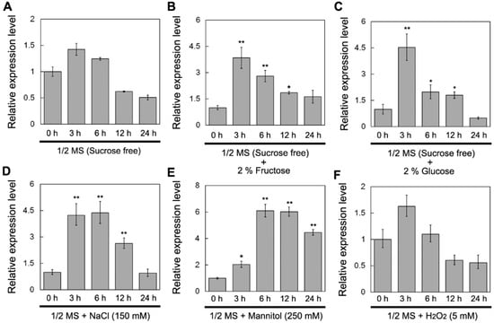 4.7. Sugar Treatment and Stress Tolerance Assay
