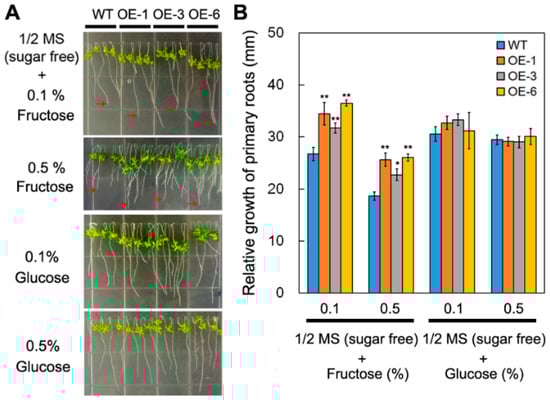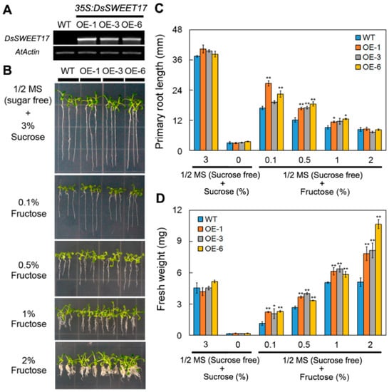 2.3. Overexpression of DsSWEET17 in Arabidopsis Affects Seedling Growth in the Presence of Exogenous Fructose