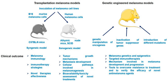 The xenograft melanoma mouse models were obtained by inoculation of different melanoma cell lines into immunocompromised mice (summarized in Table 1) [50,79].