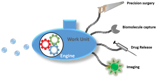The development of tiny nanomotors able to precisely perform complex surgical operations inside a patient, to administrate drugs directly in the diseased tissue, or to analyze the amount of pathogenic agents with astonishing accuracy is no longer a science fiction tale. Since the inspiring lecture of Prof. Feynman in 1959 about the unlimited possibilities within the nanoscale [1], scientists of many different fields have joined forces in order to develop novel technologies capable of observing matter in atomic scale, to manipulate atoms or molecules with extraordinary precision and to assembly nanometric objects into autonomous nanomachines. A nanomotor should be composed of at least two principal parts: an engine and a work unit. The engine is responsible for the production of kinetic energy from a certain potential energy source such as chemical energy, radiations, or magnetic fields, among others. This engine provides motion capacity to the nanodevice. The work unit should be able to recognize a signal, which can be a biomolecule, and then—to provide a controlled response such as radiation emission—open or close valves or to provoke a directional change in the translational motion of the device (Figure 1). The principles which govern the fabrication of macroscopic machines are not valid for the construction of nanometric ones. Locomotion in an environment with a low Reynolds number is strongly affected by Brownian motion and, therefore, the physical principles which rule the nanomotor’s behavior in this scale should be taken into account [2,3,4]. There are different strategies available for achieving locomotion at the nanoscale depending on the fuel or energy employed. Nanomotors powered by chemical reactions usually create reagents/products or electrical gradients which propel the systems by self-difussiophoresis [5] or self-electrophoresis [6] mechanisms, or produce oxygen bubbles which propel the nanodevice in a similar way to a conventional rocket [7,8]. Magnetic fields have also been employed for the propulsion of nanomotors. In this case, helical or flexible microwires are able to exhibit fast locomotion when they are exposed to rapid changes in the magnetic field orientation which mimicks bacterial flagella [9,10]. The exposure of the material surface of a nanomotor to certain light wavelengths catalyzes reactions producing chemical gradients which can be used as propulsion force. Thus, TiO2 [11] or AgCl nanoparticles have shown excellent locomotion capacities under UV exposure, being able to destroy pollutants or bacteria at the same time [12]. Finally, the use of ultrasounds (US) for propelling nanomotors has provided an interesting alternative in order to guide them to specific locations, even within living organisms, due to the capacity to focus these mechanical waves with high precision [13].
