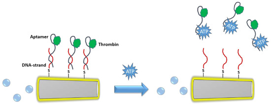 Wang et al. have employed aptamers-modified microrockets for the capture of thrombin from human serum samples [21]. The system is based on metallic microtubes (microrockets) which present Pt in the inner surface and Au in the external face. The Pt core is responsible for the generation of the propulsion force, because this metal catalyzes the decomposition of hydrogen peroxide into water and molecular oxygen. Thus, when the motor is submerged in a solution which contains small amounts of hydrogen peroxide, the continuous bubble formation propels the rocket following a jet-based propulsion mechanism [22]. The gold surface was decorated with thiolated aptamers thanks to the high affinity of the sulfur atom by Au, which rapidly forms a covalent bond at room temperature in the aqueous phase. Aptamers are DNA strands which can bind specifically to different biomolecules through intermolecular interactions between the tridimensional structure of the DNA strand and specific points of the biomolecule [23]. Thus, the explicit sequence of the attached aptamer allowed the capture of thrombin from the sample and its transportation into a clean zone. Additionally, the nanomotor surface was decorated with a mixed binding aptamer which contained two recognition regions for ATP and thrombin, respectively. Thus, this system was able to capture thrombin and release it when ATP was present, as a consequence of a conformational change caused by the ATP binding event which triggered the aptamer release from the Au surface (Figure 2). The resulting nanomotor has demonstrated excellent properties for the detection of important biomolecules because this methodology can be easily tuned for the capture of many different biological moieties, thanks to the great versatility of aptamers. Antibodies can also be attached to the surface of tubular microrockets in order to capture biomolecules. García et al. have immobilized antibodies against immunoglobulin G (Anti-IgG) on the polymeric surface of Ni/Pt microtubes coated with poly(3,4-ethylenedioxythiophene) (PEDOT) functionalized with carboxylic acids [24]. The antibody was attached employing the well-known carbodiimide chemistry which activates the carboxylic acids, located on the polymer-coated microtube surface, transforming them into more reactive esters that react with the amine groups, naturally present in the antibody. Similar to the previous system, this nanomotor was capable of propelling itself in a media enriched in H2O2 by oxygen bubble formation, capturing the protein during flying. Thanks to the presence within the tube of a Ni core, which interact with magnetic fields, this system was magnetically guided throughout a microchip channel network, allowing the transportation of the captured proteins towards clean spots.