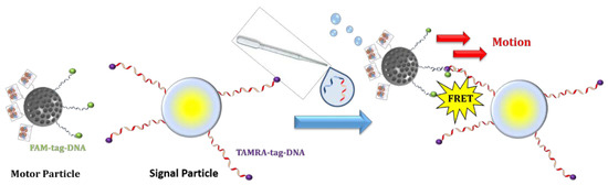 Deoxyribonucleic acid (DNA) is one of the most important molecules in all living organisms on Earth. This molecule codes the entire information of an organism, being the instruction manual of each living being. DNA is copied to ribonucleic acid (RNA) in order to translate its coded information for protein synthesis. Therefore, the analysis of DNA or RNA is critical for the early diagnosis of a plethora of different diseases, from cardiovascular pathologies to cancer. Nowadays, the analysis of these important biopolymers is mainly based on polymerase chain reaction (PCR), which is a technique that mimics the natural DNA replication mechanism for amplifying the DNA strands present within a sample. This reaction increases the concentration of these macromolecules and facilitates their detection [29]. The main limitation of this, and other related techniques, is that they usually require time-consuming pre-purifications steps which increase the time of the analysis and also raises their cost. At this point, the use of nanomotors for DNA isolation and analysis can speed up the process due to the self-propelled behavior of these machines which can be employed in order to carry out the DNA isolation, similar to the case of the proteins mentioned above. In 2010, Wang et al. reported one of the first motor-based DNA sensors which exploited the observed speed differences in Au–Pt nanowires in the presence of silver [30]. In this assay, DNA strands complementary to the DNA analyte were attached on a gold surface. Then, a second DNA strand complementary to other section of the DNA analyte was attached on the surface of Ag nanoparticles. When the DNA analyte was present in the media, the Ag nanoparticles were retained on the surface by the formation of a sandwich DNA complex between the DNA attached on the gold surface, the DNA anchored on the Ag nanoparticle, and the DNA analyte, which acted as bridge. After this process, a solution with Au–Pt nanorods and H2O2 as fuel was added. The speed of the Au–Pt nanorods was strongly enhanced by the presence of Ag+ in the media and, therefore, the greater amount of DNA, the greater concentration of Ag+ in the media and the higher the nanomotor speed that was observed, it being possible to quantify the DNA concentration in the sample. Despite the innovative nature of this assay, its suitability was not very high because it required several steps. Additionally, the precise nanomotor speed determination is quite difficult. The same research group developed another motor-based DNA assay based on the use of tubular microrockets, asymmetrically covered with gold on one side and having a Pt core able to propel themselves in a solution of H2O2 [31]. In this system, thiolated DNA strands, which are complementary to certain DNA or RNA sequences present in pathogen organisms, were anchored on the gold surface of the micromotors. The analyte DNA or RNA sequences were tagged with fluorescent nanoparticles in order to facilitate their detection. These micromotors were capable of capturing the pathogen oligonucleotide strands “on-the-fly” and transporting them to a clean chamber, where the detection could be carried out without any interference. Minteer et al. have reported the development of other “on-the-fly” capture system but, in this case, the micromotor captured the engine instead of the signal if a certain DNA strand was present in the media [32]. This nanodevice was based on PEDOT/Au nanorods decorated on the gold surface with DNA strands which captured Pt nanoparticles functionalized with a second DNA strand. If the desired DNA was present in the environment, the nanorods captured the Pt nanoparticles (engines) by a sandwich hybridization between the three oligonucleotide strands causing the motion of the device. The average speed of these nanorods was dependent on the DNA amount and it indicated its concentration in the media. Another strategy also based on an indirect strategy to detect DNA was presented by Simmchen et al. employing Janus mesoporous silica nanoparticles [33]. In this case, the authors proposed the use of asymmetrically functionalized nanoparticles as nanomotors which were decorated with catalase (engine) in one hemisphere and DNA strands on the other side. Catalase was selected as engine because this enzyme catalyzes the decomposition of H2O2 generating oxygen bubbles with a high efficacy, significantly higher than Pt, allowing the motor motion in environments with a really low fuel concentration. These nanomotors were able to capture and transport a signal particle which were functionalized with DNA strands complementary to a certain DNA analyte sequence due to the formation of a sandwich complex, similar to the others mentioned above. In order to discard the possibility that the capture process could have occurred by unspecific interactions between both systems (the motor particle and the signal particle) fluorescein was attached at the end of the DNA attached on the motor particles and the DNA strands present on the signal particle were labeled with TAMRA. The assembly of both particles occasioned a clear fluorescence emission in the emission wavelength of TAMRA when the sample was irradiated in the excitation wavelength of fluorescein (Figure 3). The apparition of this phenomenon, called Föster resonance energy transfer (FRET), indicated that both fluorophores were placed closer than 5 nm, as a consequence of the DNA hybridization, corroborating that the motor-signal assembly was caused by the presence of the DNA analyte in the media. Moreover, employing a DNA analyte which has one base mismatched to the complementary strand, the FRET effect disappeared and the motion in the signal particles was not observed. This last property indicates the high specificity of this type of sensors.