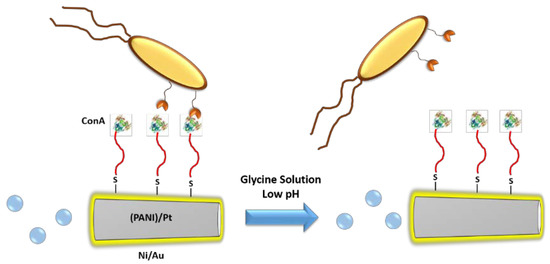 In other work, the Wang’s group reported the fabrication of a three-segment Au@Ni@Au nanowire capable of capturing bacteria propelled by ultrasounds [46]. In this work, the nanowires were fabricated by template electrodeposition methods yielding Au@Ni@Au (0.8 μm/0.2 μm/0.8 μm) in which the Nickel segment was necessary for controlling the orientation of the nanowire by the application of a static magnetic field. The gold segments were decorated with MUA and then functionalized with recognition moieties (ConA or anti-protein A) able to recognize different bacteria such as E. coli or S. aureus, respectively. A concave end in the nanowire was introduced in the fabrication process employing a sacrificial Cu layer at the beginning of the electrodeposition procedure. Ultrasounds generated a pressure gradient when they entered in this concave end and, therefore, propelled the nanosystem even in high-ionic environments, which is a great advantage in comparison with the systems propelled by hydrogen oxide decomposition, that are only suitable for media of low ionic strengths. Another advantage of ultrasound-based propulsion is that the average rate of the motors is not affected by the functionalization of the gold rods, as is the case with chemically propelled nanowires. Not only complete bacteria but also spores have been captured using micromotors. This is particularly important because spores are much more resistant than bacteria to common chemical antibacterial treatments such as bleach, chlorine dioxide, or paraformaldehyde, as a consequence of their strong protective coating. Thus, polypyrrole (PPy)-COOH/PEDOT/Ni/Pt microtubes functionalized with antibodies against spores of Bacillus globigii (B. globigii), a simulant of Bacillus anthracis, were able to capture these spores from real samples of tap and lake water and then destroy them in a more effective manner, in combination with antimicrobial agents, thanks to the improved mixing caused by the motor motion [47].