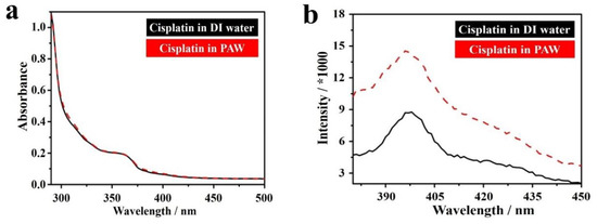 Conformation of cisplatin in DI water and PAW. (a) The absorption spectra of cisplatin in DI water and PAW. (b) The PL spectra of cisplatin in DI water and PAW with an excitation wavelength of 350 nm. (c) The conductivities of cisplatin solutions in DI water and PAW with time [77].