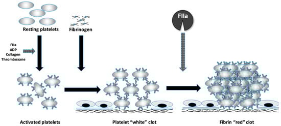 A sketch representing the physiologic role of fibrinogen in the clot formation. The fibrinogen molecule links activated platelets together (white clot) through the alphaIIb–beta3integrin that serves as the fibrinogen receptor. In addition, it is transformed in fibrin by the action of activated thrombin (FIIa), which further stabilizes the fibrin clot by activating FXIII.