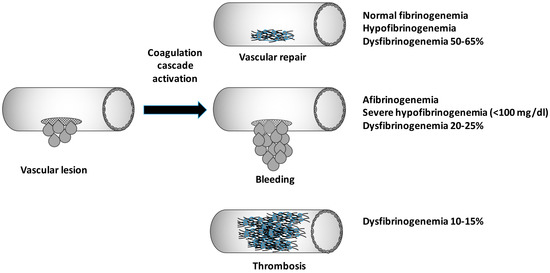 Dysfibrinogenemic patients have an unpredictable clinical phenotype, ranging from bleeding to thrombosis, or both; however, most individuals are asymptomatic. In the clinical context of dysfibrinogenemia, the genotype-phenotype correlation would be of help, because a series of gene variants mostly associated with bleeding symptoms (e.g., p.Arg38Ser variant) have been described, while others have been shown to confer a thrombotic phenotype. The fibrinogen alpha chain p.Ser551Cys variant—fibrinogen Caracas V—was observed in a Venezuelan kindred, which showed thrombosis events, probably due to an impaired fibrinolysis [79]. The fibrinogen alpha chain p.Arg573Cys—fibrinogen Dusart/Paris V—was described in a dysfibrinogenemic family presenting with both pulmonary embolism and recurrent thrombosis [80]. The fibrinogen beta chain p.Arg44Cys variant was identified in a dysfibrinogenemic with thrombosis [81]. Other studies confirmed the association between the p.Arg44Cys variant and a dysfibrinogenemia-related thrombosis tendency (see the Human Fibrinogen Database). Finally, the fibrinogen beta chain p.Arg74Cys variant has been found associated with dysfibrinogenemia and venous thrombosis [82].