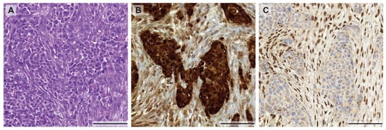 Morphological and immunohistochemical heterogeneity in mesothelioma. (A) Biphasic mesothelioma consisting of an epithelioid and sarcomatoid component (H&E stain), highlighted by a calretinin staining (B) showing a weaker expression in the sarcomatoid proliferation. (C) Heterogeneous expression of BAP-1 with positive nuclear staining in the sarcomatoid component and loss of BAP-1 expression in the epithelioid areas of the tumor. All pictures were taken at 10× magnification (scale bar: 100 µm).