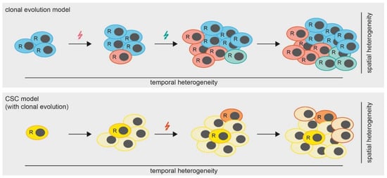 Models of tumor heterogeneity. In the clonal evolution model (upper panel) all cells are able to replicate (indicated by “R”). Mutations (colored arrows) are gained over time, leading to the formation of subclones which results in a heterogeneous tumor. In the cancer stem cell (CSC) model with clonal evolution, only CSCs are able to replicate. However, mutations occurring over time lead to the formation of additional CSCs.