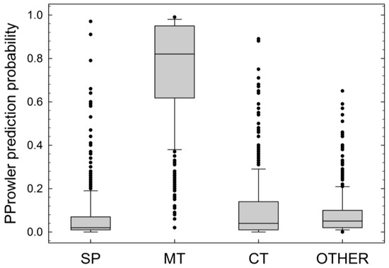 Subcellular prediction for proteins of the LEA_3 family. The graph shows the probability of subcellular targeting for 390 proteins of the LEA_3 family to different compartments (SP, secretory pathway; MT, mitochondria targeting; CT, chloroplast targeting) according to the PProwler software. Peroxisomal targeting probability is not indicated (null for all proteins). The 390 proteins selected are the best matches retrieved using the LEA38 protein sequence as the query in a BLASTP search against the NCBI Reference Sequence protein database, and all belong to the LEA_3 family. The boundary of the box closest to zero indicates the 25th percentile, a line within the box marks the median, and the boundary of the box farthest from zero indicates the 75th percentile. Whiskers (error bars) above and below the box indicate the 90th and 10th percentile, respectively.