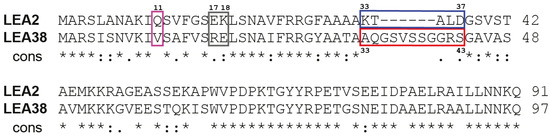 Comparison of LEA2 and LEA38 protein sequences. Amino acid alignment was performed with LALIGN. The degree of similarity between amino acids occupying the same position is indicated by the following symbols: “*” identity; “:” strong similarity; “.” weak similarity. Sequence differences selected to generate mutated LEA2 proteins are indicated by colored boxes.
