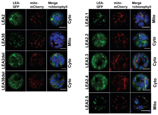 The mutated genes were cloned into an expression vector in order to express the proteins of interest as translational fusions with GFP at their C-terminus. The constructs were used to transiently transform protoplasts from an Arabidopsis line expressing a mitochondrial mCherry marker [25]. LEA2-GFP and LEA38-GFP, used as controls, displayed their expected cytosolic and mitochondrial localizations, respectively (Figure 3).