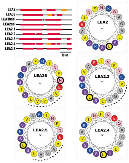 Secondary structure predictions for LEA2, LEA38, and mutated proteins. Secondary structure predictions for the first 50 amino acids (top left part of the figure) were performed using JPRED4 software. Red box: alpha-helix: orange box: extended strand; black line: random coil. Helical projections of α-helices were obtained using 18 amino-acids at the beginning of the first helix in the indicated proteins. The helical projections of LEA38, LEA38del, and LEA2.1, which share the same sequence in the analyzed region, are identical, as well as those of LEA2, LEA2del, and LEA2.2. The first residue is circled in black. Positively charged residues (K, R) are color coded in blue, while negatively charged residues (D, E) are in red. Non-polar residues are shown in yellow or grey and others in purple, light blue, or light pink colors. The arrow of variable size in the center of the helix shows the weight and orientation of the hydrophobic moment, and the dotted line identifies the hydrophobic face.