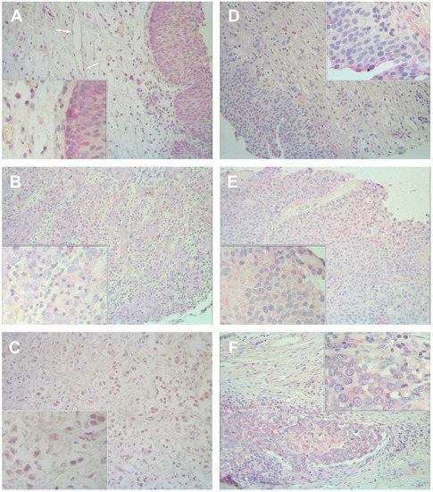 Immunohistochemical staining of AGO1 and AGO2 in bladder tissue. Representative images show the expression of AGO1 in non-malignant bladder tissue (A), in non-muscle-invasive pT1 tumor (B) and muscle-invasive pT3b tumor tissue (C); as well as the expression of AGO2 in normal bladder tissue (D), in non-muscle-invasive pTa tumor (E) and muscle-invasive pT3b tumor tissue (F). The arrows indicate the staining in endothelial cells (A) and AGO2 staining of lymphocytes (F). Pseudoluminal expression of AGO2 can be seen in (D). Magnification: 200×, inserts 400×.