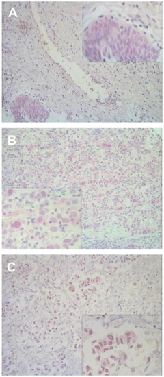 Immunohistochemical staining of Drosha in bladder tissue. Representative images show the expression of Drosha in non-malignant bladder tissue (A), in non-muscle-invasive pT1 tumor (B) and muscle-invasive pT3b tumor tissue (C). The staining of endothelial cells can be seen in (A). Magnification: 200×, inserts 400×.