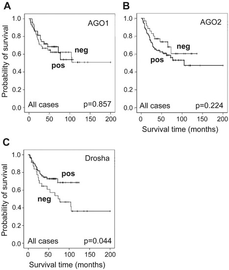 Kaplan–Meier analysis showing overall survival time of bladder cancer patients as a function of AGO1, AGO2 and Drosha levels. Dichotomized expression was not associated with overall survival for 96 cases of AGO1 (A) and 107 cases of AGO2 staining (B), but Drosha significantly indicated a higher probability of survival with positive expression regarding the 104 available cases (C). The overall survival time was defined as the months elapsed between transurethral resection or radical cystectomy and death or the last follow-up date. Censored cases were marked (+). Statistical significance was given as p < 0.05. Pos: positive, neg: negative.