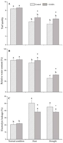 Effects of γ-aminobutyric acid (GABA) on (A) turf quality (TQ), (B) relative water content (RWC), and (C) electrolyte leakage (EL) in creeping bentgrass under normal, heat, and drought conditions. Vertical bars indicate ±standard error (SE) of mean (n = 4). Different letters above columns indicate significant differences for one particular treatment (control or +GABA) under different conditions; asterisk “*” indicates significant difference between control and +GABA treatment under a given condition.