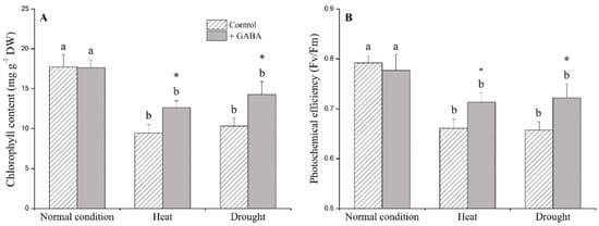 Effects of γ-aminobutyric acid (GABA) on (A) chlorophyll content (Chl) and (B) photochemical efficiency (Fv/Fm) in creeping bentgrass under normal, heat, and drought condition. Vertical bars indicate ±SE of mean (n = 4). Different letters above columns indicate significant differences for one particular treatment (control or +GABA) under different conditions; asterisk “*” indicates significant difference between control and +GABA treatment under a given condition.