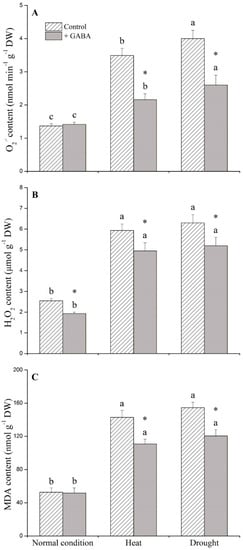 Effects of γ-aminobutyric acid (GABA) on (A) superoxide anion (O2−), (B) hydrogen peroxide (H2O2), and (C) malondialdehyde (MDA) content under normal, heat, and drought condition. Vertical bars indicate ±SE of mean (n = 4). Different letters above columns indicate significant differences for one particular treatment (control or +GABA) under different conditions; asterisk “*” indicates significant difference between control and +GABA treatment under a given condition.