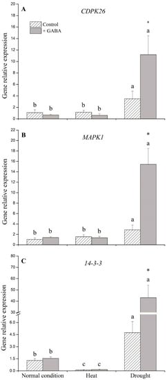 Effects of γ-aminobutyric acid (GABA) on genes’ expression of (A) CDPK26, (B) MAPK1, and (C) 14-3-3 under normal, heat, and drought conditions. Vertical bars indicate ±SE of mean (n = 4). Different letters above columns indicate significant differences for one particular treatment (control or +GABA) under different conditions; asterisk “*” indicates significant difference between control and +GABA treatment under a given condition.
