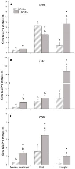 Effects of γ-aminobutyric acid (GABA) on genes’ expression of (A) superoxide dismutase (SOD), (B) catalse (CAT), and (C) peroxidase (POD) under normal, heat, and drought conditions. Vertical bars indicate ±SE of mean (n = 4). Different letters above columns indicate significant differences for one particular treatment (control or +GABA) under different conditions; asterisk “*” indicates significant difference between control and +GABA treatment under a given condition.