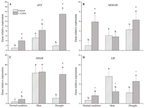 Effects of γ-aminobutyric acid (GABA) on genes’ expression of (A) ascorbate peroxidase (APX), (B) monodehydroascorbate reductase (MDHAR), (C) dehydroascorbate reductase (DHAR), and (D) glutathione reductase (GR) under normal, heat, and drought conditions. Vertical bars indicate ±SE of mean (n = 4). Different letters above columns indicate significant differences for one particular treatment (control or +GABA) under different conditions; asterisk “*” indicates significant difference between control and +GABA treatment under a given condition.