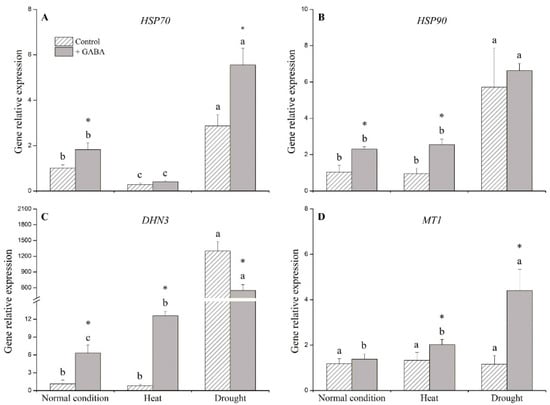 Effects of γ-aminobutyric acid (GABA) on genes’ expression of (A) heat shock protein 70 (HSP70), (B) heat shock protein 90 (HSP90), (C) dehydrin 3 (DHN3), and (D) metallothionein 1 (MT1) under normal, heat, and drought conditions. Vertical bars indicate ±SE of mean (n = 4). Different letters above columns indicate significant differences for one particular treatment (control or +GABA) under different conditions; asterisk “*” indicates significant difference between control and +GABA treatment under a given condition.