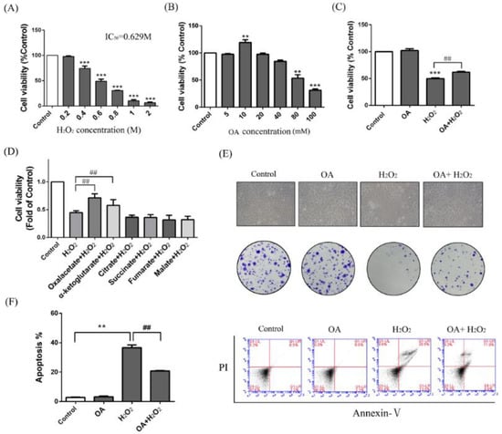 Hepatoprotective effect of oxaloacetate (OA) on human normal liver cells (LO-2 cells) against hydrogen peroxide (H2O2) injury. (A) The LO-2 cells were treated with 0.2, 0.4, 0.6, 0.8, 1, and 2 M H2O2 for 24 h. Cell viability was measured using an 3-(4,5)-dimethylthiahiazo (-z-y1)-3,5-di- phenytetrazoliumromide (MTT) assay; (B) MTT assay. The LO-2 cells were treated with 5, 10, 20, 40, 80, and 100 mM OA for 24 h; (C) MTT assay. Groups were as described in “Methods: Cell line and Reagents”; (D) MTT assay. The LO-2 cells were pretreated with 10 mM different TCA substrates before treatment with 600 mM H2O2; (E) Cell microscopic morphology (200×) and colony formation. Groups were as described in “Methods: Cell line and Reagents”; (F) Annexin V-PI assay. Groups were as described in “Methods: Cell line and Reagents”. The column chart shows the percentage of apoptotic cells in each group. The experiments were repeated at least three times. The results were presented as the mean ± standard deviationc (SD). ** p < 0.01, *** p < 0.001 compared with the control group and ## p < 0.001 compared with H2O2-treated group.