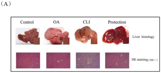 As shown in Figure 2a, the liver morphology of the control group and the OA group was normal: The structure was intact, the capsule was smooth, the color was ruddy, and the texture was soft. However, the liver injury of the CLI group was obvious: The liver was yellowish-brown and swollen, the texture was fragile, the edge was blunt, the capsule was tense, and the miliary granules were diffused. Compared with the control group, the degree of lesion in the protective group was relieved. We further performed hematoxylin-eosin (HE) staining on tissue sections. In the control group and OA group, the hepatic lobule structure was clear, the cell morphology was normal, and the hepatic cords were arranged regularly. In the CLI group, the liver exhibited a high degree of ballooning degeneration and accumulation of fatty vacuoles and inflammatory cells. In the protective group, the severity of the lesions was reduced. The liver tissues of all groups were assigned a pathological score according to the Inspection and Assessment Standard for Health Food issued by the Ministry of Health of the People’s Republic of China. There were almost no lesions in the control group and the OA group. The average pathological score of the CLI group reached 3.25. Compared with the CLI group, the average pathological score of protection group reached 2.8 (Figure 2b). Based on the histology and pathology results, OA had protective effects on chronic liver injury caused by CCl4.