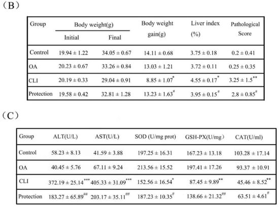 Hepatoprotective effect on carbon tetrachloride (CCl4)-induced chronic liver injury in mice. (A) Liver tissue of mice and corresponding hematoxylin-eosin (HE) staining. Groups were as described in “Methods: animal”. The tissue was enlarged locally and diffusion miliary dots were observed in the chronic liver injury (CLI) group; the HE staining was 200×; (B) Body weight gain, liver index, and pathological score. Groups were as described in “Methods: animal”; (C) The activity of alanine transaminase (ALT), aspartate aminotransferase (AST), superoxide dismutase (SOD), glutathione peroxidase (GSH-PX), and catalase (CAT). Groups were as described in “Methods: animal”. Data was the mean ± SD of n = 10 mice/group. * p < 0.05, ** p < 0.01, *** p < 0.001 compared with the control group and # p < 0.05, ## p < 0.01 compared with the CLI group.
