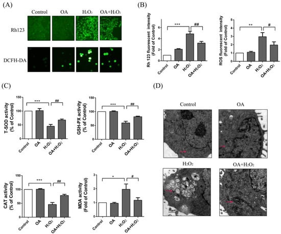 Effects of OA on reactive oxygen species (ROS) and morphology of mitochondria. (A) The membrane potential changes and ROS production were detected by Rh123 and DCFH-DA probes respectively by fluorescence microscope (200×). Groups were as described in “Methods: Cell line and Reagents”; (B) The fluorescence intensity of Rh123 and ROS was measured by FCM; (C) The activity of SOD, GSH-PX, CAT, MDA. Groups were as described in “Methods: Cell line and Reagents”; (D) The morphology of mitochondria by transmission electron microscopy. Groups were as described in “Methods: Cell line and Reagents”. Pink arrows point to mitochondria. The experiments were repeated at least three times. The results were presented as the mean ± SD. * p < 0.05, ** p < 0.01, *** p < 0.001 compared with the control group and # p < 0.05 and ## p < 0.01 compared with the H2O2 group.
