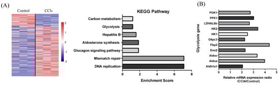 The gene expression profiles of rat liver tissues after CCl4 treatment were downloaded from GEO (GSE73494) [44]. We selected data for the present study in accordance with the following inclusion criteria: (1) The genes had been named publicly and (2) where the ratios of 48 h group signals to 0 h group signals were ≥2 or ≤0.5. An unsupervised hierarchical clustering analysis of genes meeting these criteria was conducted using the edgeR package (3.5.0, Berkeley Heights, NJ, USA), and several glycolysis-related genes which were expressed differentially were selected for further investigation.