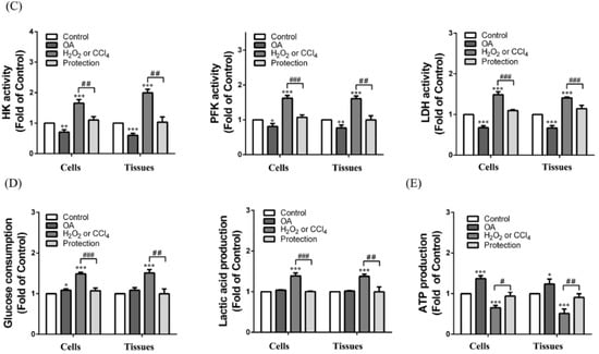 Using KEGG pathway enrichment, we found that the expression of glycolysis-related enzymes was markedly elevated with CCl4 treatment in the liver (Figure 4a,b). We hypothesized that when the mitochondria were injured, it must have increased glycolysis to provide energy and adjust for any substance deficiencies. With H2O2 or CCl4 treatment, the enzymatic activity of hexokinase (HK), phosphofructokinase (PFK), and lactate dehydrogenase (LDH) were increased to 1.84 ± 0.01, 1.5 ± 0.08, and 1.41 ± 0.32-fold of the control group in the cells and 1.93 ± 0.06, 1.86 ± 0.12, and 1.48 ± 0.41-fold of the control group in the tissues (Figure 4c). The increase of enzyme activity resulted in the increase of glucose consumption and lactic acid production in the cells and tissues (Figure 4c). With OA pretreatment (protection group), the enzyme activity of HK, PFK, and LDH returned to normal in the cells and tissues. With OA pretreatment, glucose consumption and lactic acid production were decreased to 79.27 ± 7.28% and 85.71 ± 4.28% of the H2O2 group in the cells, and were decreased to 64.21 ± 3.52% and 53.22 ± 5.51% of the CCl4 group in the tissues. (Figure 4c). However, glycolysis in this situation was not enough meet the energy requirement. We further examined the generation of ATP in the cells and tissues. The results showed that ATP output was increased to 1.94 ± 0.33 and 2.41 ± 0.28-fold of the control group with OA treatment in the cells and tissues. ATP output was increased to 1.24 ± 0.25-fold of the H2O2 group and 1.65 ± 0.48-fold of the CCl4 group with OA pretreatment in the cells and tissues (Figure 4e). Here, we suggest that OA led to an increase in ATP production and a decrease in anaerobic energy supply through restoration of aerobic energy supply.