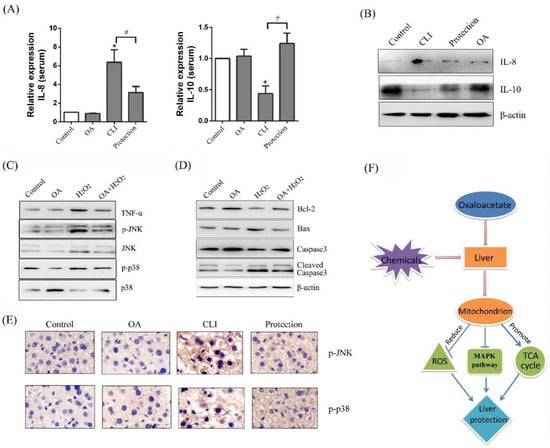 Effects of OA on mitogen-activated protein kinase (MAPK) pathway. (A) ELISA of IL-8 and IL-10 in the serum. Groups were as described in “Methods: animals”. The experiments were repeated at least three times. The results are presented as the mean ± SD. * p < 0.05, compared with the control. # p < 0.05, compared with the CLI group; (B) Western blot of interleukin-8 (IL-8) and IL-10 in the serum. Groups were as described in “Methods: animals”; (C) Western blot of tumor necrosis factor-α (TNF-α), p-JNK, N-terminal kinase (JNK), p-p38, and p38 mitogen-activated protein kinase (p-38) in the LO-2 cells. Groups were as described in “Methods: Cell line and Reagents”; (D) Western blot of Bcl-2, Bax, Caspase3, Cleaved-caspase3, β-actin in the LO-2 cells; (E) Immunohistochemistry of p-JNK, p-p38 in the tissues (400×). Groups were as described in “Methods: animals”; (F) Schematic presentation of hepatoprotective effect of OA in the liver.