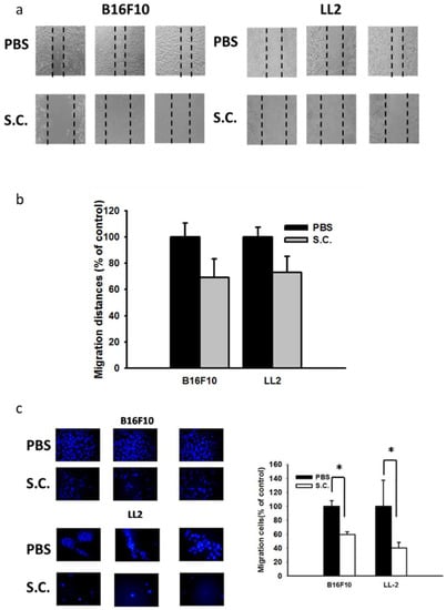 Effects of Salmonella (S.C.) on cellular migration in B16F10 and LL2 cells. B16F10 cells and LL2 cells (2 × 105 cells/well) were placed onto plates and incubated at 37 °C for 24 h. The cells cocultured with Salmonella (Multiplicity Of Infection (MOI) = 10) for 4 h. The migration distances of different groups of B16F10 and LL2 cells were shown (a) and measured (b) (×400); (c) Tumor cells were placed on the upper layer of a cell culture insert with permeable membrane and then treated with Salmonella (MOI = 10) for 4 h. Following an incubation 24 h, the cells migrated through the membrane were stained with 4′,6-Diamidino-2-Phenylindole (DAPI) and counted under a fluorescence microscope (×400).