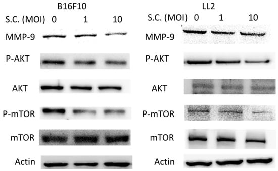 Effects of Salmonella (S.C.) on Matrix MetalloProteinase 9 (MMP-9) expression in B16F10 and LL2 cells. B16F10 cells and LL2 cells (2 × 105 cells/well) were placed into plates and incubated at 37 °C for 24 h. The cells cocultured with Salmonella (MOI = 1–10) for 4 h. The protein expression of B16F10 and LL2 cells was measured.