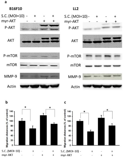 Constitutively active- Phosph-Protein Kinase B (P-AKT) reduced Salmonella (S.C.)-induced decrease of MMP-9. The B16F10 and LL2 cells were transfected with constitutively active AKT plasmids for 16 h prior to 4 h Salmonella treatment. (a) The expression of phosphorylation AKT, AKT, phosphorylation Phosph-mammalian Targets Of Rapamycin (P-mTOR), mTOR, and MMP-9 protein in B16F10 and 4T1 cells was determined. The immunoblotting assay was repeated three times with similar results. The migration distances of B16F10 (b) and LL2 (c) cells were measured. (n = 3, data are mean ± SD. * p < 0.05).