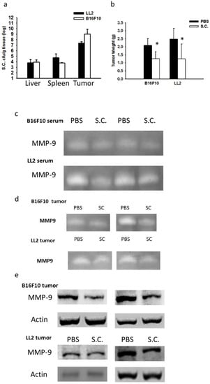 Salmonella (S.C.) reduced the function and expression of MMP-9 in vivo. The C57BL/6 mice had been subcutaneously inoculated with B16F10 and LL2 cells at day 0, and the tumor bearing mice were intraperitoneal injected with Salmonella (106 cfu) at day 7. At day 10, the mice were sacrificed. The serum, tumors, livers, and spleen were collected. (a) The amounts of accumulated Salmonella in organs was determined; (b) The antitumor activity of Salmonella was determined by tumor weight. (n = 4, data are mean ± SD. * p < 0.05); The enzyme activity of MMP-9 in serum (c) and tumors (d) was determined by gelatin zymography; (e) The protein expression of MMP-9 in tumors derived from Salmonella-treated mice or control mice was determined by Western blotting.