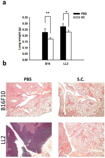Salmonella (S.C.) inhibited metastasis in vivo. The C57BL/6 mice were injected with B16F10 and LL2 cells (105) pre-incubated with or without Salmonella (MOI = 10) for 4 h via the tail vein at day 0. (a) At day 20, the wet lung weight of the lungs was measured. (n = 3, data are mean ± SD. * p < 0.05; ** p < 0.01). (b) The metastatic pulmonary nodules were observed after the intravenous injection of cells (×400).