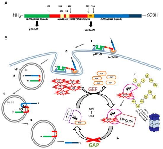 It has recently been discovered that CNF1 can bind two different receptors. The p37/ laminin receptor precursor (p37/LRP), crucial for CNF1 action, and the Lutheran adhesion glycoprotein/basal cell adhesion molecule (Lu/BCAM), necessary for the binding between toxin and cells. The toxin enters mammalian cells by receptor-mediated, clathrin-independent endocytosis: CNF1 binds to laminin receptor 67LR and its precursor p37/LRP through the N-terminus (aa 1–342) and to Lu/BCAM through a region located close to the C-terminal catalytic domain [21,22]. CNF1 N-terminal portion has two cell-interaction sites and, after binding to its receptors, enters endocytic vesicles by receptor-mediated endocytosis; progressively, the toxin is routed to the endosomal compartment and the catalytic domain is transferred into the cytosol [23]. The CNF1 translocation domain presents two helices (H1 and H2) separated by a hydrophilic loop, which is thought to be essential for the membrane collocation [24]. It has been demonstrated that a toxin fragment of approximately 55-kDa containing the catalytic domain and an additional part is present in the cytosol (Figure 1B). Its processing requires an acidic pH (≤5.2) and the insertion of the toxin into the endosomal membrane [19]. The cleavage site of CNF1 is located between amino acids 536 and 542. Experiments with CNF1 mutants have shown that the processing and release of the catalytic part from the endosomes is essential for the full biological activity of CNF1. Presumably, this release occurs from late endosomes, because the destruction of the microtubules, necessary for the maturation from early to late endosomes, results in weaker CNF1 toxicity [23,25].