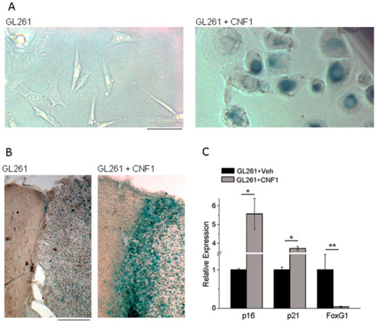 CNF1 treatment triggers senescence of glioma cells. (A) β-galactosidase staining (blue; a marker for senescence) in cultured GL261 glioma cells treated with either vehicle (left) or CNF1 (right). Note multinucleated, senescent cells after CNF1 treatment; (B) Representative brain sections from glioma-bearing mice treated with either vehicle (left) or CNF1 (right). Note robust staining for β-galactosidase (blue) in the CNF1-treated sample. Scale bar = 10 µm for (A), 100 µm for (B); (C) Quantitative real-time PCRs showing the relative expressions of the senescence markers p21 (Cdkn1a, Cyclin-dependent kinase inhibitor 1) and p16 (Cdkn2a, Cyclin-dependent kinase inhibitor 2), and the negative p21 regulator FoxG1 (Forkhead box protein G1) in GL261 cells treated with CNF1 or vehicle. * p < 0.05, ** p < 0.01. Panel B modified and C taken from Vannini et al., 2016 [63].