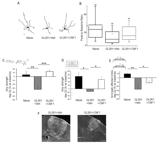 - Vannini, E.; Maltese, F.; Olimpico, F.; Fabbri, A.; Costa, M.; Caleo, M.; Baroncelli, L. Progression of motor deficits in glioma-bearing mice: Impact of CNF1 therapy at symptomatic stages. Oncotarget 2017, 8, 23539–23550. [Google Scholar] [CrossRef] [PubMed]
