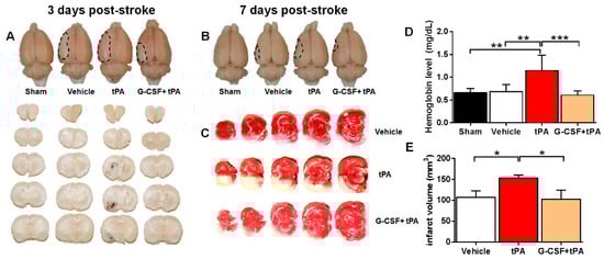 Effects of granulocyte-colony stimulating factor (G-CSF) on delayed tissue plasminogen activator (tPA)-induced hemorrhage and cerebral infarction in rats subjected to thromboembolic stroke. (A) Photographs are representative coronal brain sections obtained 3 days after stroke, showing that tPA treatment produced remarkable hemispheric hemorrhage, whereas the combined treatment with G-CSF did not result in bleeding; (B) Infarct volume was reduced, and hemorrhage was not observed in rats treated with G-CSF 7 days after stroke; (C) Representative coronal brain sections stained with 2,3,5-triphenyltetrazolium chloride (TTC) 3 days after stroke showing the infarct area (white) and intact areas (red); (D) Quantitative analysis of spectrophotometric assay findings showing the incidence of hemorrhage in rats subjected to delayed tPA treatment, which was reduced by 47% by G-CSF treatment; (E) Quantitative analysis of infarct volume in vehicle-, tPA-, and G-CSF + tPA-treated groups. G-CSF reduced infarct volume by 33% in stroked rats subjected to delayed tPA treatment; * p < 0.05, ** p < 0.01, *** p < 0.001, n = 7 rats per group. The data are expressed as mean ± S.E.M.