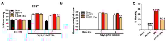 Effects of G-CSF on delayed tPA-induced motor and neurological deficits and mortality. (A) G-CSF treatment reduced delayed tPA-induced motor deficits by 15% as measured by the elevated body swing test (EBST); (B) G-CSF also reduced stroke and/or delayed tPA-induced neurological impairment by 25% when administered 7 days after stroke; (C) G-CSF decreased the incidence of mortality by 46% in stroke rats given tPA 6 h after stroke; ** p < 0.01 tPA vs. G-CSF + tPA, n = 10 rats per group. The data are expressed as mean ± S.E.M.