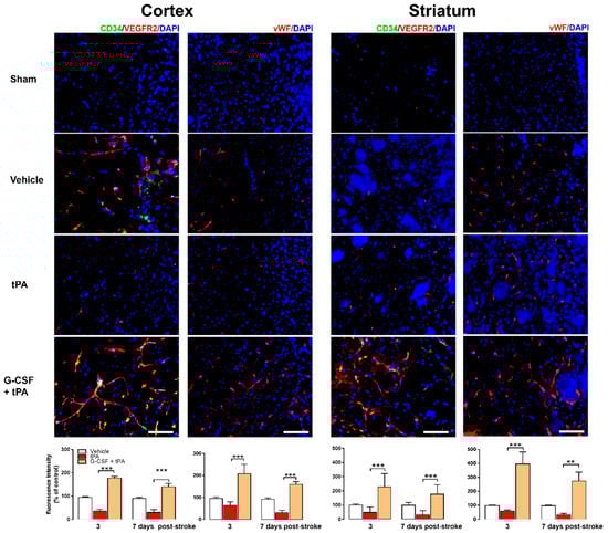 The surface markers CD34+ and VEGFR-2 have been used extensively to characterize EPCs [,,,]. We examined the expression levels of these markers in the ischemic cortex and striatum in all rats 3 and 7 days after drug treatment and in the brains of the sham animals. Representative images obtained 3 days after stroke showed higher expression of CD34+ and VEGFR-2 in the ischemic cortex and striatum of G-CSF + tPA-treated rats compared with vehicle- and tPA-treated animals (Figure 3). Two-way ANOVA of CD34+ and VEGFR-2 total fluorescence intensity revealed significant effects of day (F (1, 15) = 6.45, p < 0.05) and treatment (F (2, 15) = 68.43, p < 0.001), but no interaction between day and treatment. Post-hoc tests revealed higher CD34+ and VEGFR-2 levels in the ipsilateral cortex of G-CSF + tPA-treated animals compared with tPA-treated rats 3 (p < 0.001) and 7 days (p < 0.001) after drug treatment. A significant treatment effect (F (2, 15) = 23.83, p < 0.001) was also found in the ipsilateral striatum of G-CSF+tPA-treated animals compared with tPA-treated rats 3 (p < 0.001) and 7 (p < 0.001) days after drug treatment. The von Willebrand factor (vWF) is a distinctive marker for vasculogenesis [,]. Representative images depicted higher vWF expression in the ischemic cortex and striatum of G-CSF + tPA-treated rats compared with vehicle- or tPA-treated animals on day 3 after drug treatment (Figure 3). Two-way ANOVA of vWF total fluorescence intensity showed a significant treatment effect (F (2, 15) = 17.42, p < 0.001), and post-hoc tests revealed higher vWF in the ipsilateral cortex of G-CSF+tPA-treated animals versus tPA-treated rats both 3 (p < 0.001) and 7 days (p < 0.001) after drug treatment. A notable treatment effect (F (2, 15) = 40.53, p < 0.001) was also found after comparing vWF fluorescence intensities in the ipsilateral striatum between G-CSF + tPA-treated rats and tPA-treated animals 3 (p < 0.001) and 7 days (p < 0.01) after drug treatment. The expression levels of the above-mentioned surface markers in the contralateral side of all rats (stroke and sham) did not vary significantly.