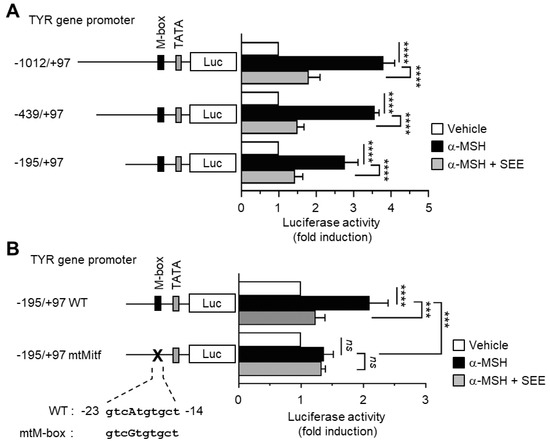 To determine whether SEE alters TYR gene promoter activity, B16F10 cells were transfected with serial deletion constructs (−1012/+97, −439/+97, and −195/+97) of the TYR gene promoter reporters. α-MSH stimulation resulted in an increase in TYR gene promoter activities, which were significantly reduced (all p < 0.0001, n = 3) by SEE pre-treatment (Figure 2A), suggesting that SEE downregulates TYR expression at the promoter level.